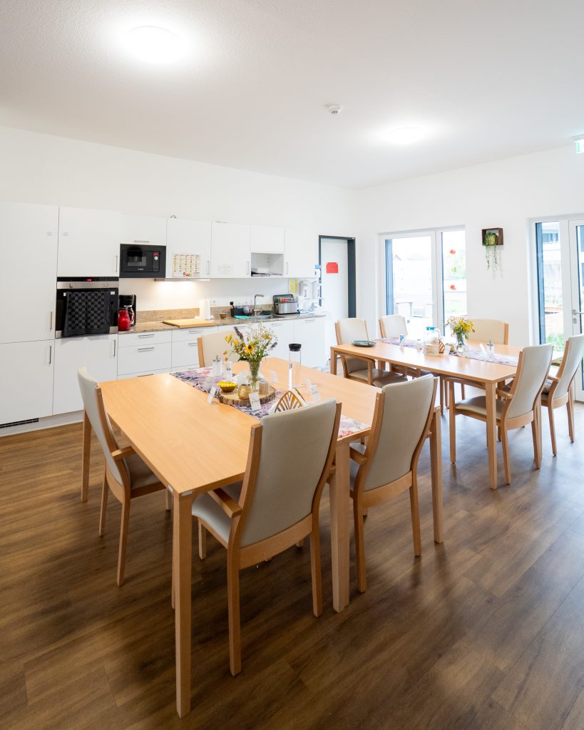 Neben den individuellen Räumlichkeiten der Bewohnern gibt es ebenfalls Gemeinschaftsflächen. Diese Räumlichkeiten dienen der Begegnung und werden von allen Bewohnenden gemeinschaftlich genutzt. Zu den Gemeinschaftsräumen zählen unter anderem die Gemeinschaftsküche und das gemütliche Wohn- und Esszimmer. Darüber hinaus gibt es eine große Dachterasse, welche zum Verweile einlädt.