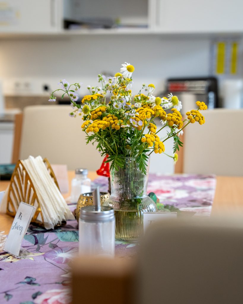 In unserer Senioren-Wohngemeinschaft darf das leibliche Wohl natürlich auch nicht zu kurz kommen. Daher bieten wir unseren Bewohnenden eine Vollverpflegung an. Zu dieser Vollverpflegung zählt, das Frühstück, Mittagessen, Kaffee und Kuchen, sowie das Abendbrot. Zusätzlich bieten wir permanent eine Auswahl an kalten und warmen Getränken an. Darüber hinaus können sich die Bewohnenden Lebensmittel und Getränke mitbringen lassen oder im Supermarkt eine Etage unter der WG selbst besorgen.